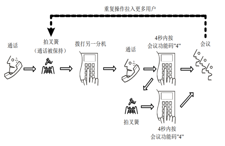 超强的无阻塞多方电话会议功能,不限内、外线,操作简单,使得每个普通电话机都可以召开内部、本地、外地区域的多方电话会议,会议成员可达3~80个。